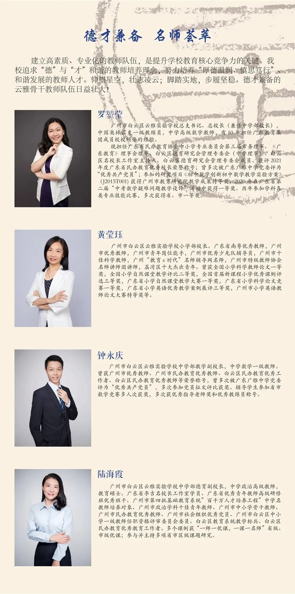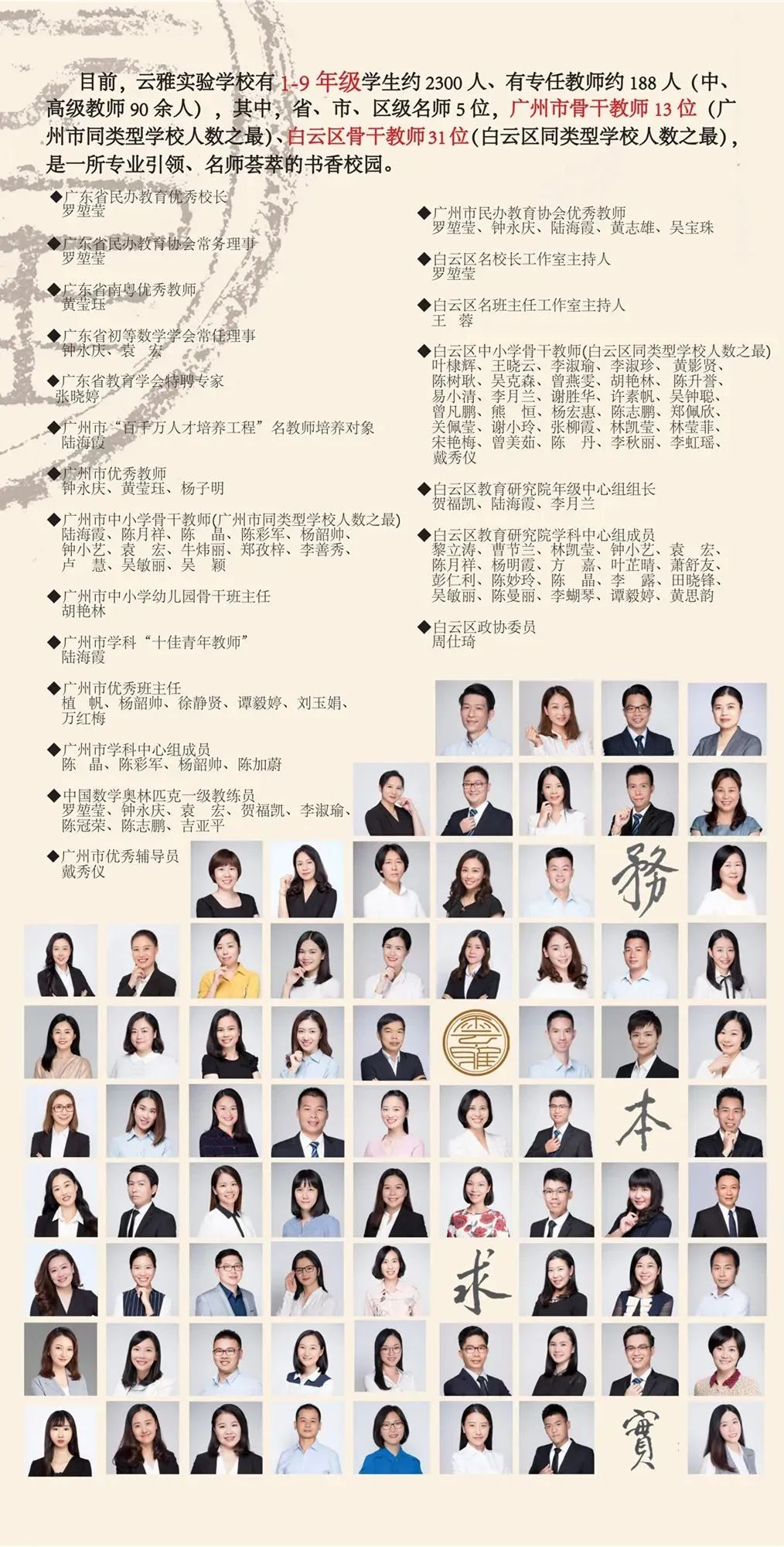 骨干教师:拥有广州市骨干教师13人、白云区骨干教师31人,涵盖数学、语文、英语、物理、化学等学科,教学经验丰富,多次在各级教学竞赛中获奖。